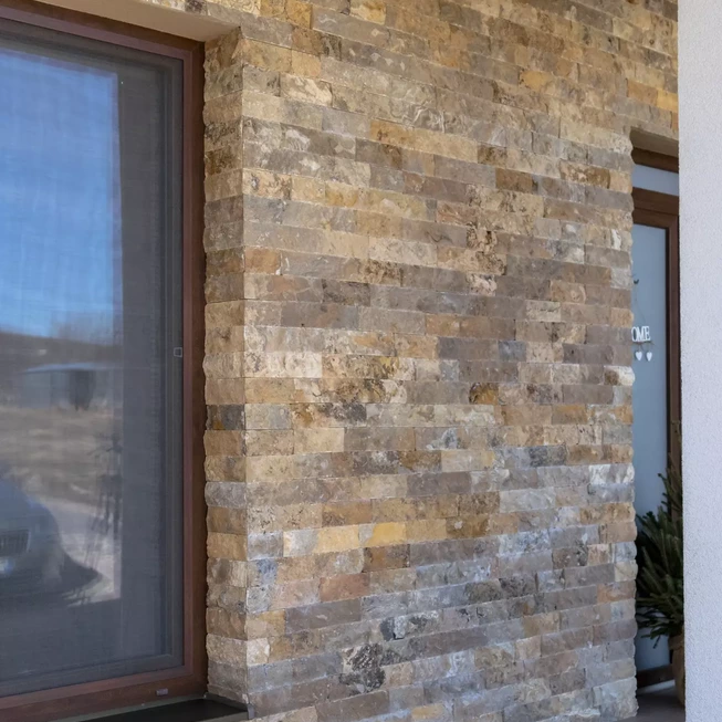 Kamenný cihličkový obklad v zajímavé barevné kombinaci colormix je vhodný do interiéru pro obklad stěn či krbů, ale i do exteriéru jako obklad fasády, soklu či zdí. Jeho hranatá struktura se podobá stěnám dávných hradů či zámků a ve spojení se zelenými trvalkami či stromky připomíná časy zapomenuté historie.