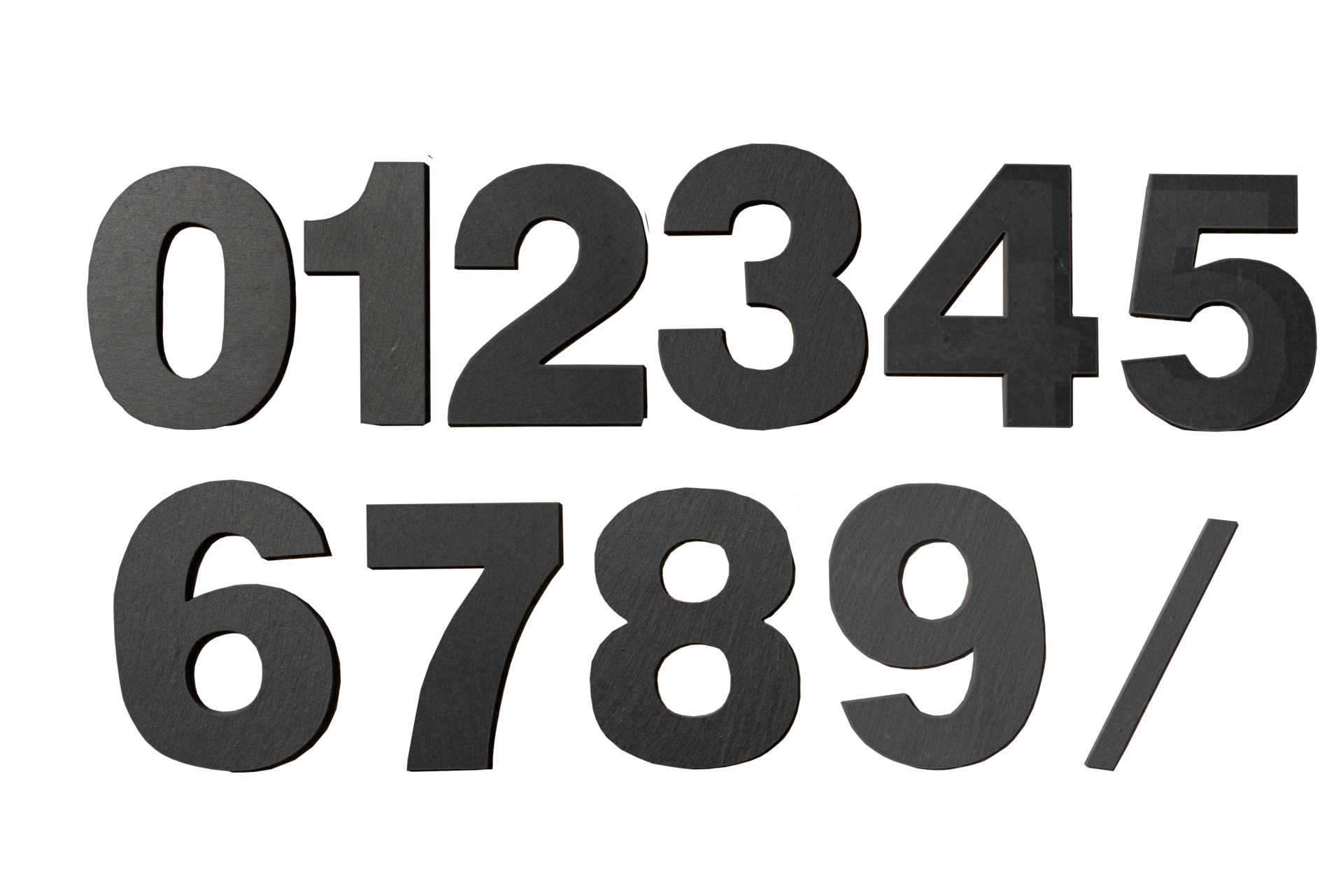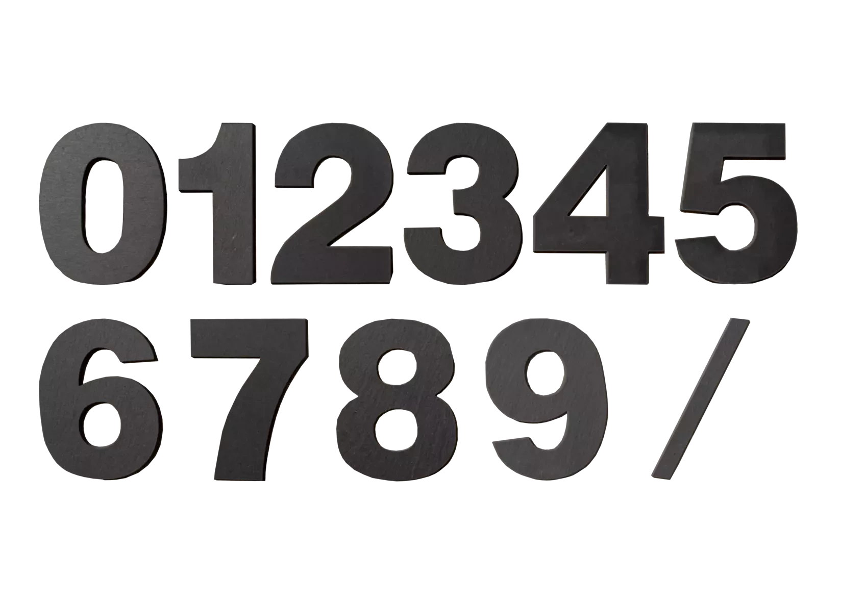 Čísla a lomítko z přírodního kamene břidlice v elegantní černé barvě ozvláštní vybraný prostor. Kamenná čísla a lomítko mají mnoho originálních využití.