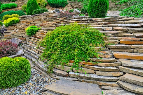 Svažitý dvůr může být nepříjemný. Dvouúrovňové dvory jsou však skvělé pro zábavu, hraní her nebo grilování v neděli odpoledne. Definujte vzhled s meziposchodím pomocí zvýšeného designu. Široké, nepravidelné kamenné schody oddělují a spojují dva odlišné prostory.