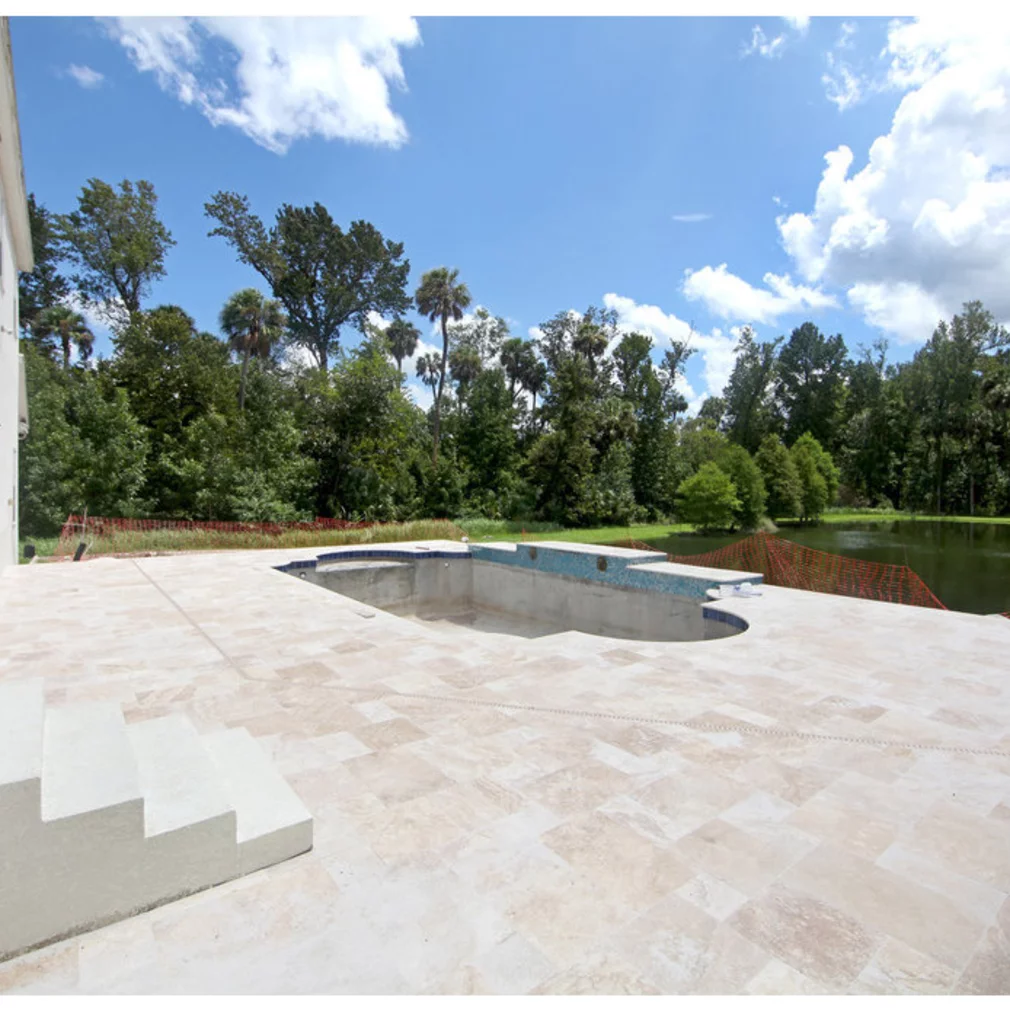 Díky mrazuvzdornosti je travertin jedním z nejvhodnějších materiálů na výstavbu okolí bazénu. Také je z travertinu díky pórovité struktuře jedinečná protiskluzová dlažba, což ocení každý rodič menších dětí.