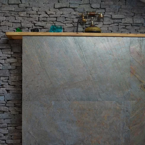 I šikmým stěnám můžete dopřát nádech elegance a luxusu v podobě přírodního kamene. Břidlicová ultra tenká tapeta působí i na šikmé stěně šik a moderně.