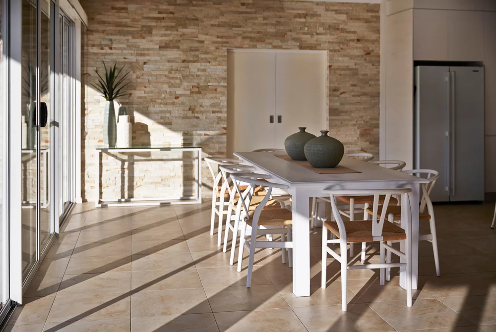 Travertin je oblíbený pro svůj jemný a přírodní vzhled s charakteristickou pórovitostí. Jeho barevné odstíny, od světle béžové až po teplou hnědou, přinášejí do interiéru pocit tepla a komfortu. Travertin se výborně hodí do koupelen, obývacích prostor či vstupních hal, kde vynikne jeho přirozená textura. Úžasné charisma dodá prostoru iv kombinaci se dřevem nebo se zelení. Velkou popularitu získal také velkoformátový travertinový obklad do interiéru, který vytváří velké konzistentní plochy pro dokonalý čistý a minimalistický vzhled.