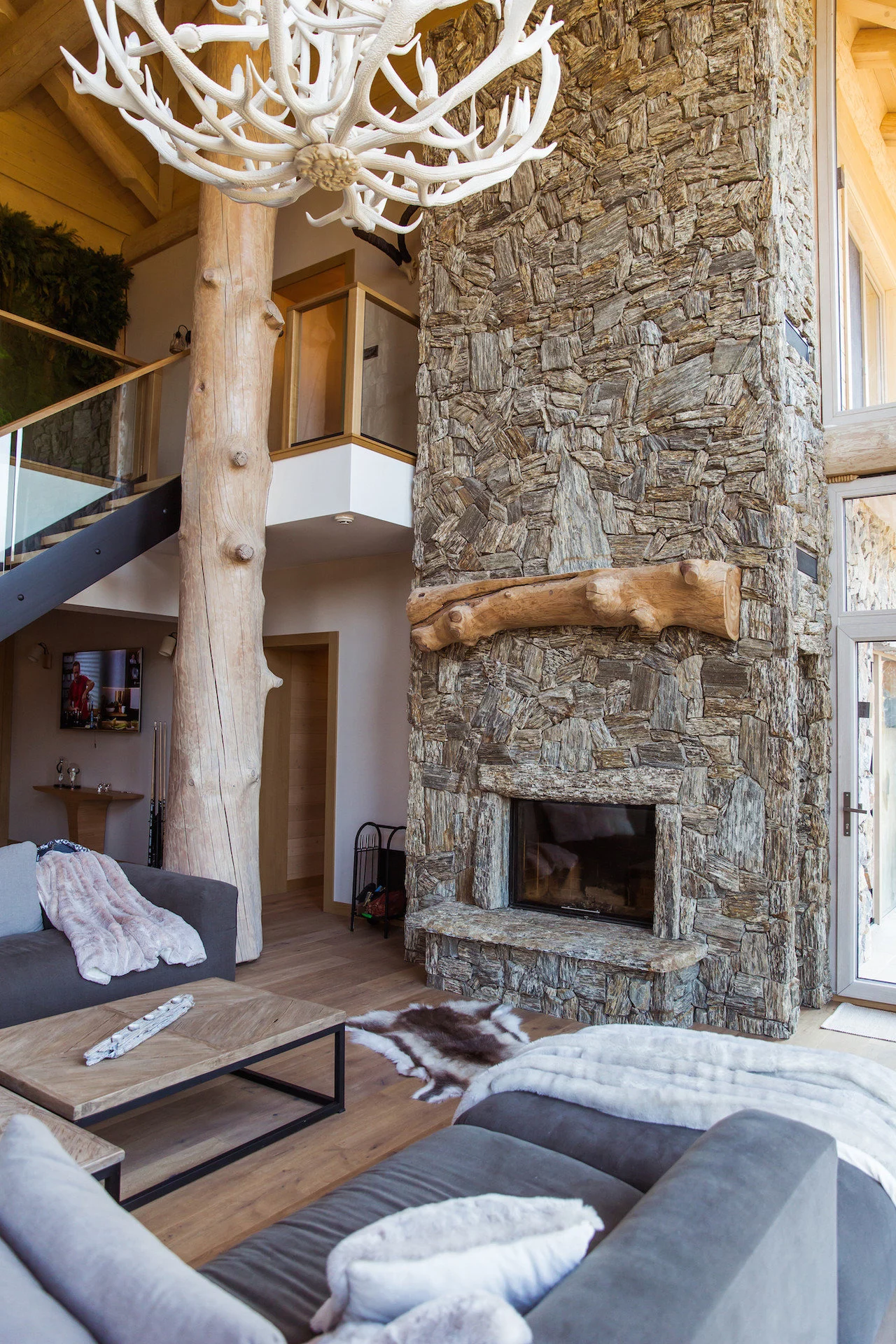 Při realizaci byl jako obklad krbu použitý kusový kámen - kamenná kůra až do celé výšky krbu 7,5 m.