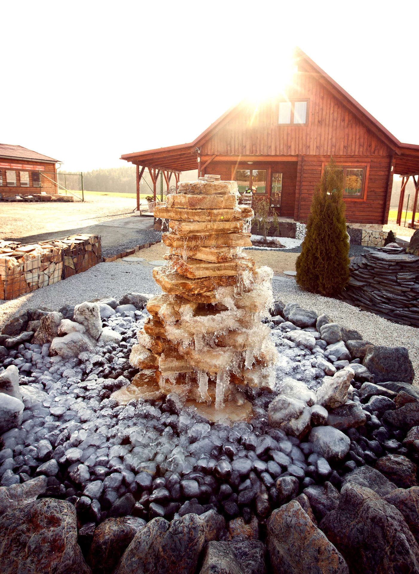 V případě, že máte k dispozici větší plochu ale nechcete klasický "potůček", můžete si vaši fontánu pohodlně vyskládat. Větší kusy kamene se kladou na sebe a přes střed se provrtá díra, kterou bude proudit voda. Taková fontána je v nabídce z přírodního kamene andezit, který náramně doplňuje venkovský a rustikální zařízenou zahradu.
