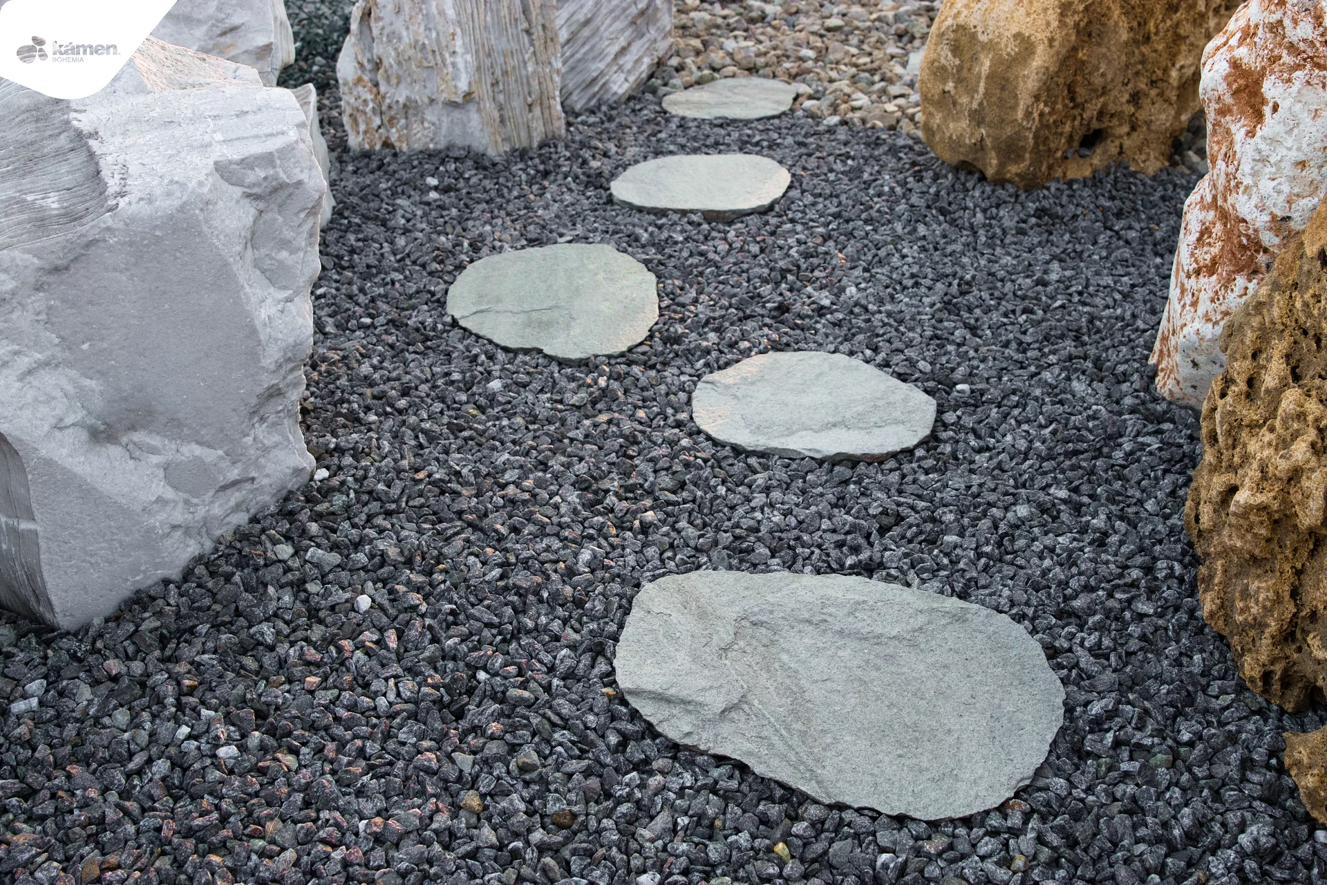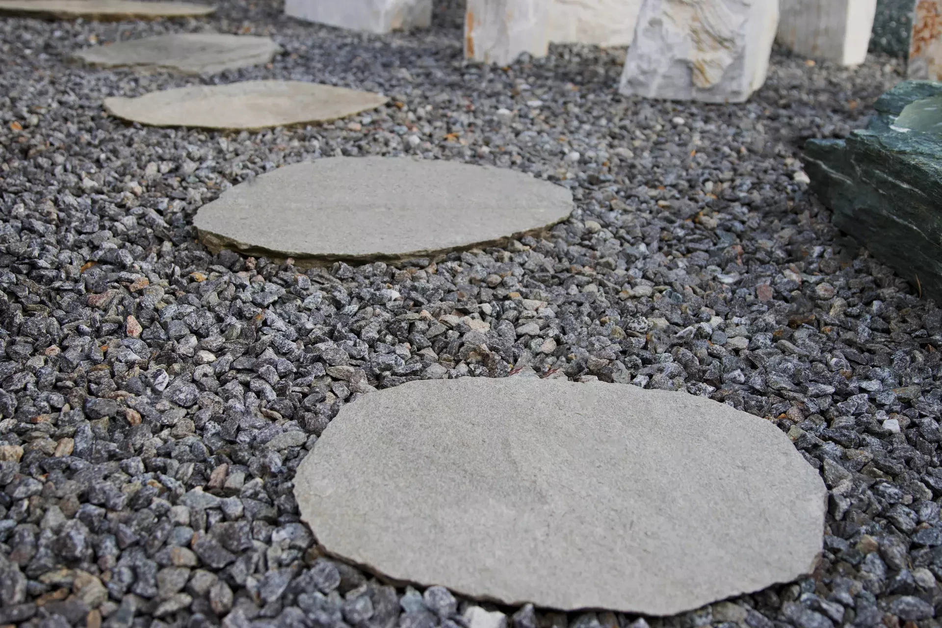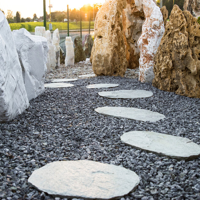 Nášlapné kameny z gneisu se náramně vyjímají v kontrastní zeleni trávníku. Zahradní chodníčky a přírodní cestičky na zahrádce v šedých odstínech propůjčí každému exteriéru jedinečnost a svéráznou originálnost. Barevným kontrastem šedého kamene a zářivého zeleného trávníku rozbijí větší, neforemné plochy na útulná zákoutí. Vyniknou v okrasných zahradách, ale "šmrnc" dodají i uhlazeným japonským zahradám. Manipulace a realizace chodníků v zahradě s gneisem je nesmírně jednoduchá. Stačí položit nášlapné kameny z gneisu na předem vybrané místo a je to. Kámen je také možné položit na předem vysypaný štěrk.