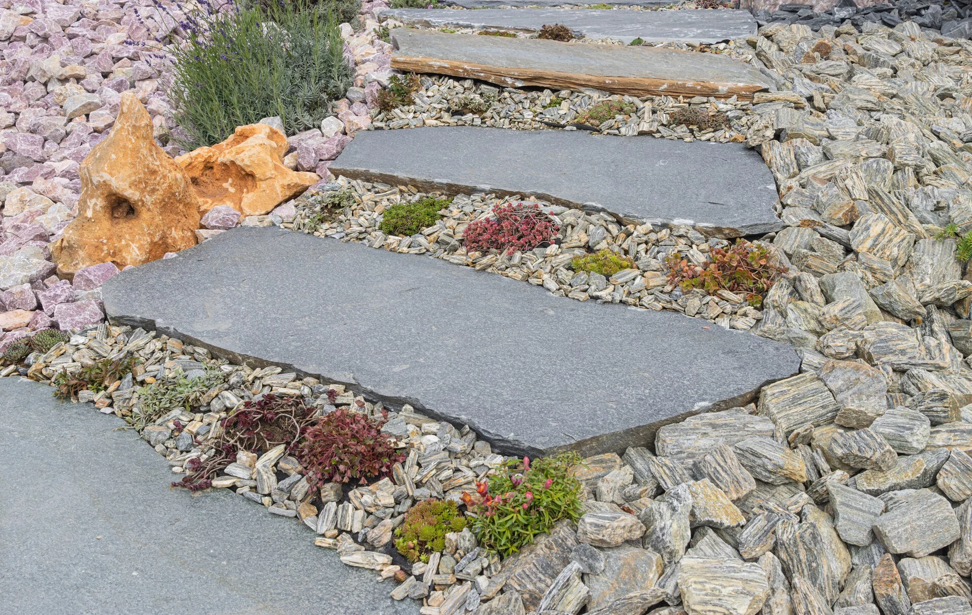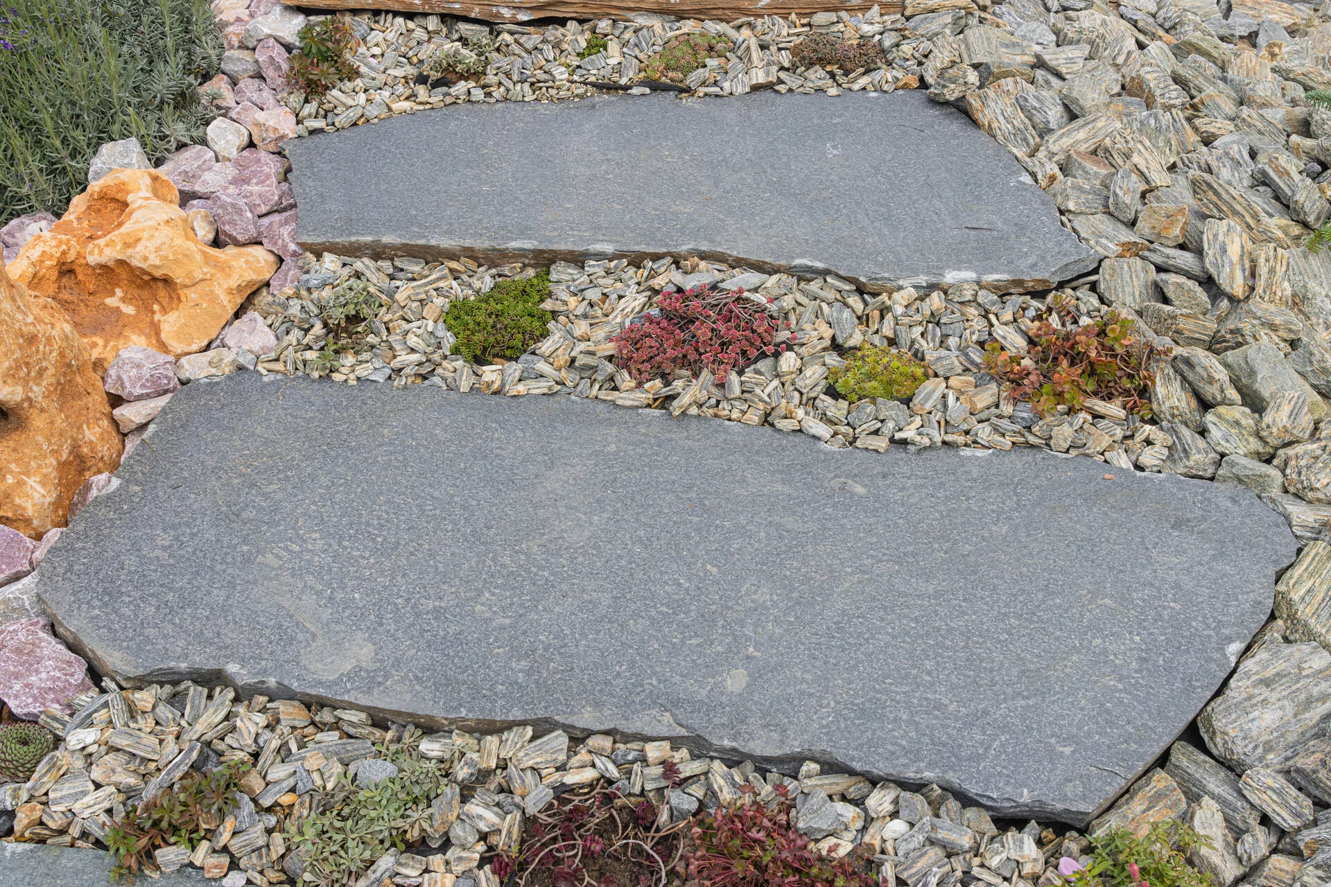 Trvanlivá kvarcitová deska v tmavě šedé barvě vhodná jako zahradní šlapák nebo vnější kamenný schod. Odolná, elegantní a ideální pro moderní i rustikální exteriér.