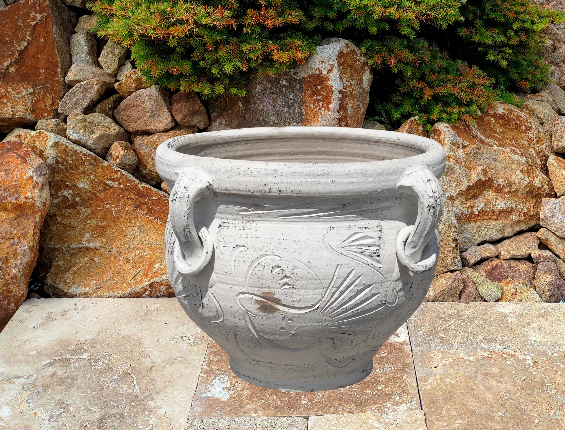 Zahradní amfora se vyrábí z pálené červené nebo červenohnědé hlíny. Výhodou každé amfory je její dostatečně těžká váha, což znamená, že i při horších povětrnostních podmínkách se nádoba nepřevrhne. Každá amfora má svůj jedinečný vzor a tvar. Často se využívá jako květináč v exteriéru na terase, altánku apod. Amforu využijete však i v interiéru či zimních zahradách. V kombinaci s rostlinami, jako jsou například speciální vyšlechtěné palmy, exotické cykasy či voňavé citroníky, promění amfora každý prostor v malý ráj dovolené. V zimním období je třeba amforu vhodně uskladnit a ochránit tak před mrazem. Oloupání barvy není předmětem reklamace, protože v procesu výroby se používá mořská sůl, která má tendenci opadat při odpaření přebytečné vody. Každý kus je originál, takže drobné nedokonalosti souvisí s ruční výrobou a dodávají nádech antiky vaší domácnosti.