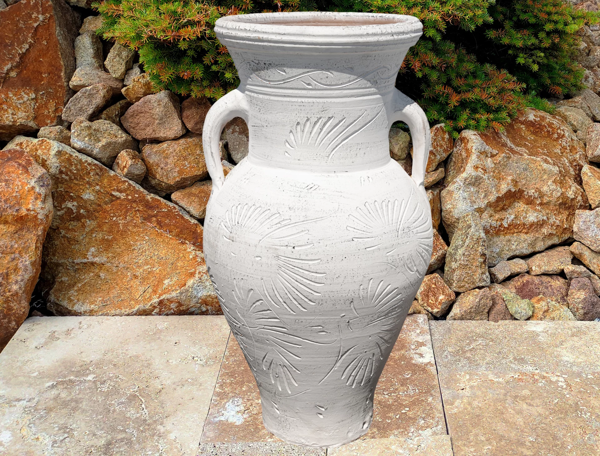 Zahradní amfora se vyrábí z pálené červené nebo červenohnědé hlíny. Výhodou každé amfory je její dostatečně těžká váha, což znamená, že i při horších povětrnostních podmínkách se nádoba nepřevrhne. Každá amfora má svůj jedinečný vzor a tvar. Často se využívá jako květináč v exteriéru na terase, altánku apod. Amforu využijete však i v interiéru či zimních zahradách. V kombinaci s rostlinami, jako jsou například speciální vyšlechtěné palmy, exotické cykasy či voňavé citroníky, promění amfora každý prostor v malý ráj dovolené. V zimním období je třeba amforu vhodně uskladnit a ochránit tak před mrazem. Oloupání barvy není předmětem reklamace, protože v procesu výroby se používá mořská sůl, která má tendenci opadat při odpaření přebytečné vody. Každý kus je originál, takže drobné nedokonalosti souvisí s ruční výrobou a dodávají nádech antiky vaší domácnosti.