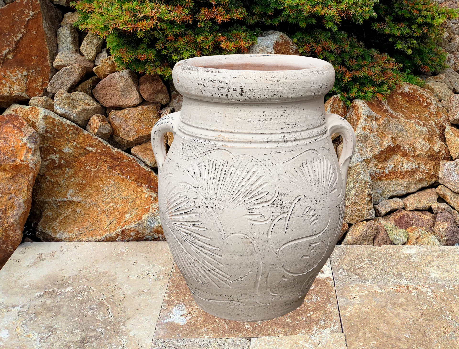 Zahradní amfora se vyrábí z pálené červené nebo červenohnědé hlíny. Výhodou každé amfory je její dostatečně těžká váha, což znamená, že i při horších povětrnostních podmínkách se nádoba nepřevrhne. Každá amfora má svůj jedinečný vzor a tvar. Často se využívá jako květináč v exteriéru na terase, altánku apod. Amforu využijete však iv interiéru či zimních zahradách. V kombinaci s rostlinami, jako jsou například speciální vyšlechtěné palmy, exotické cykasy či voňavé citroníky, promění amfora každý prostor v malý ráj dovolené. V zimním období je třeba amforu vhodně uskladnit a ochránit tak před mrazem. Oloupání barvy není předmětem reklamace, protože v procesu výroby se používá mořská sůl, která má tendenci opadat při odpaření přebytečné vody. Každý kus je originál, takže drobné nedokonalosti souvisí s ruční výrobou a dodávají nádech antiky vaší domácnosti.