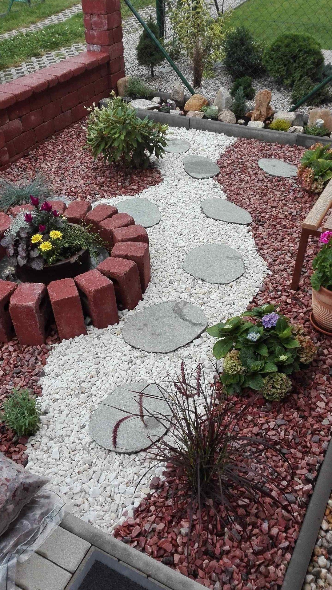 Předzahrádka rodinného domku, Praha - západ. Realizace je tvořena ze štěrků Křemenec K37, Mramor M15 a šlapáků Gneis G85