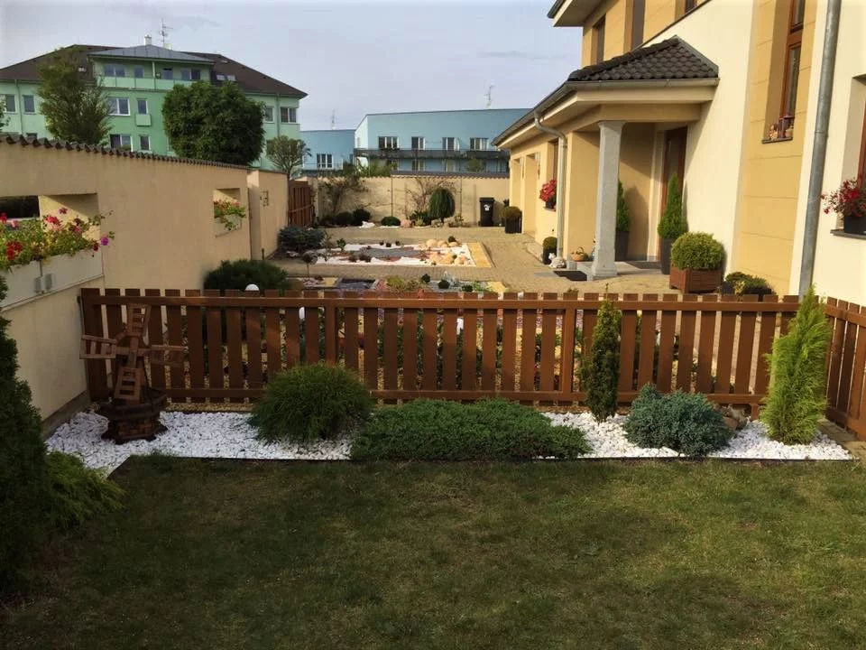 Na zahradě byly použity zejména dekorační štěrky a valouny, skryté obrubníky a různé dekorační kameny