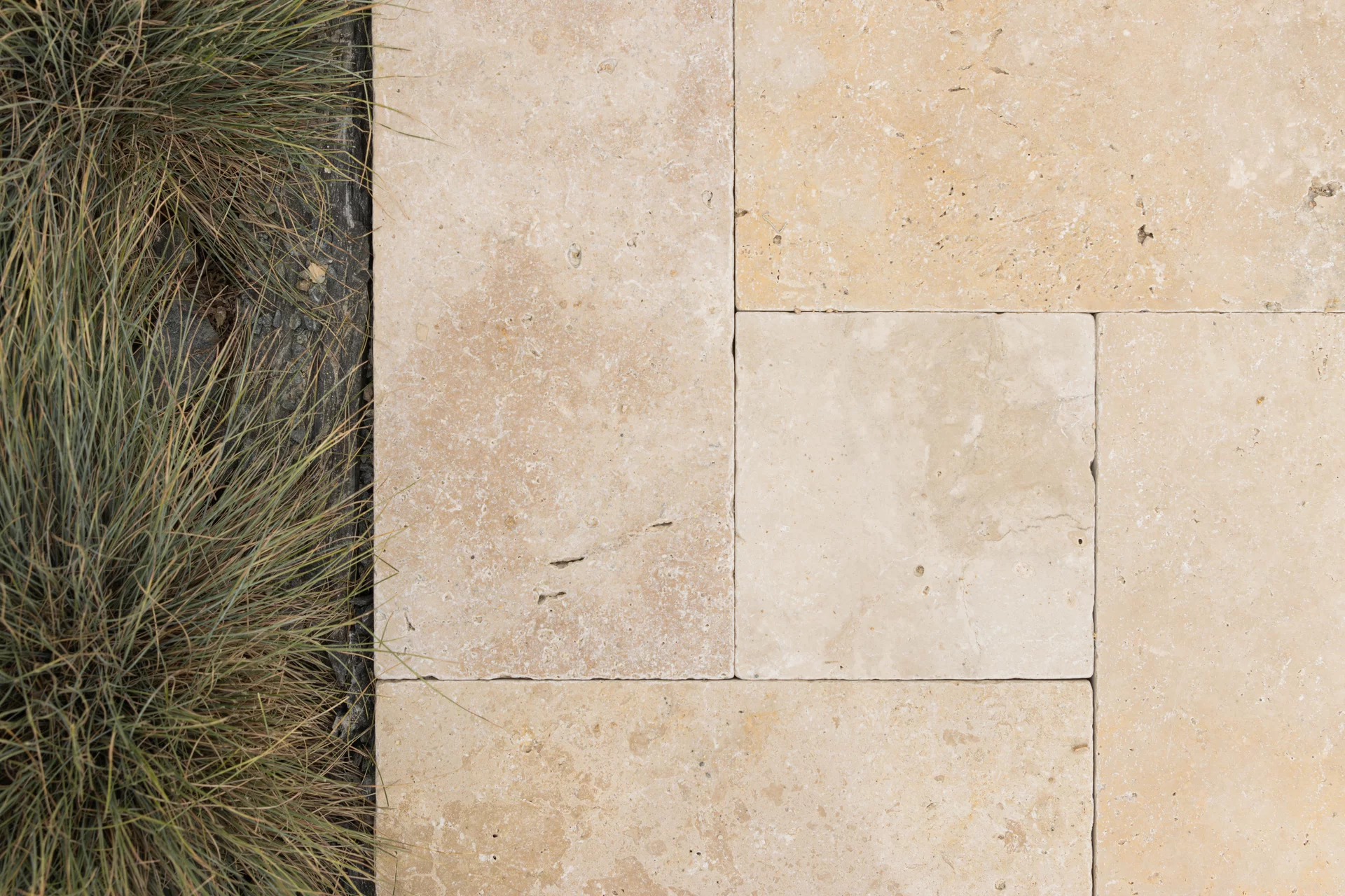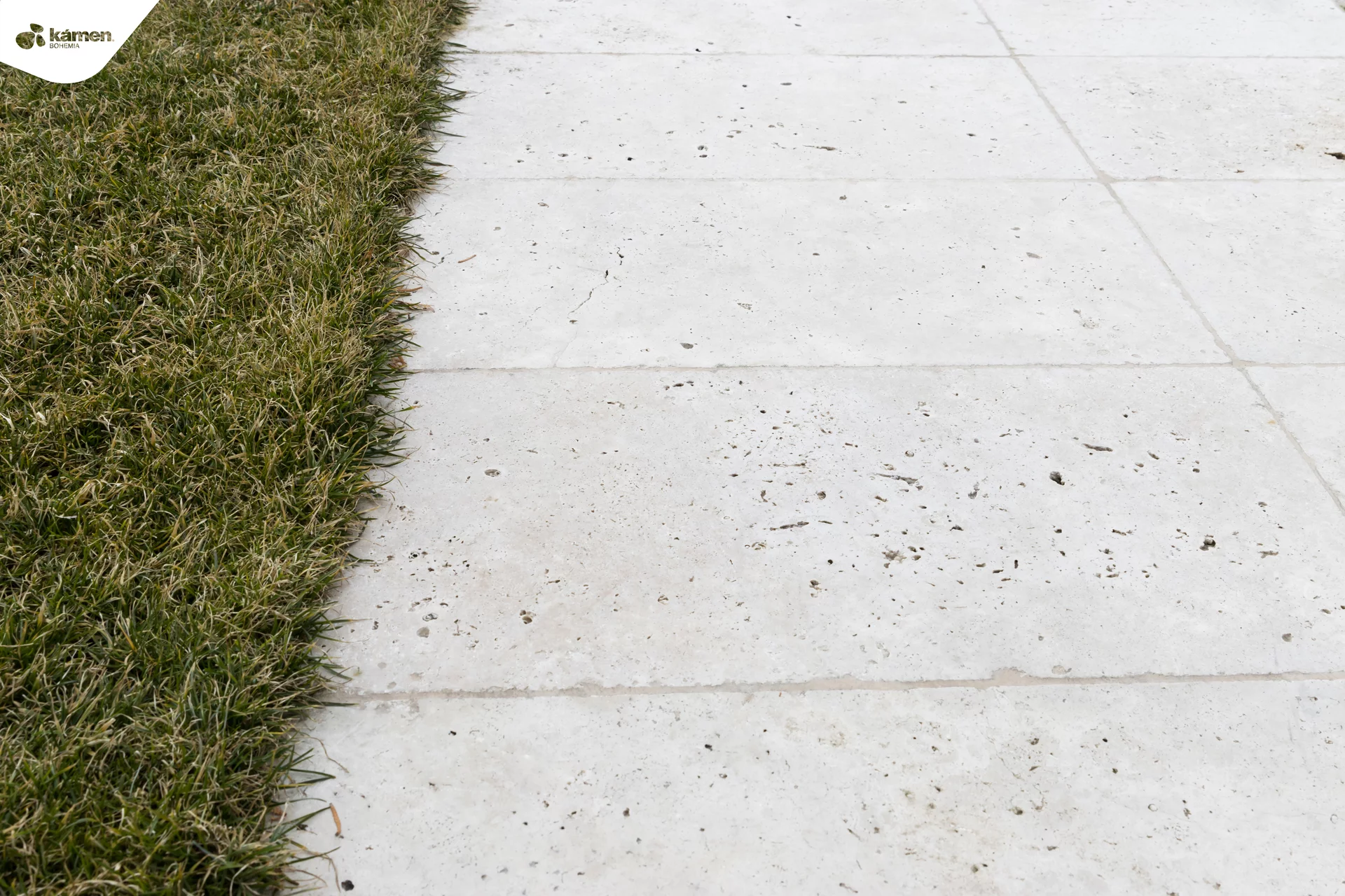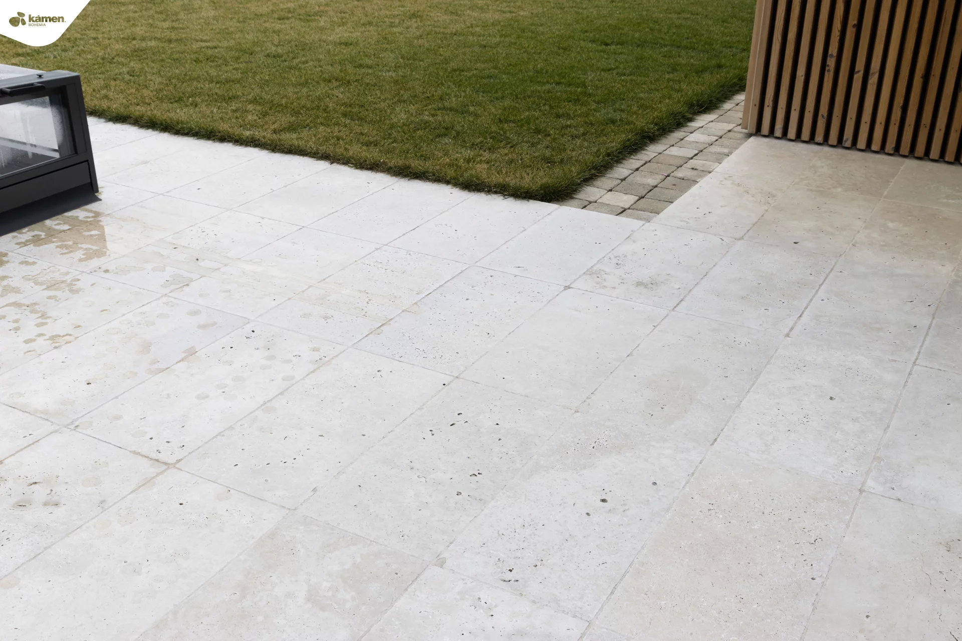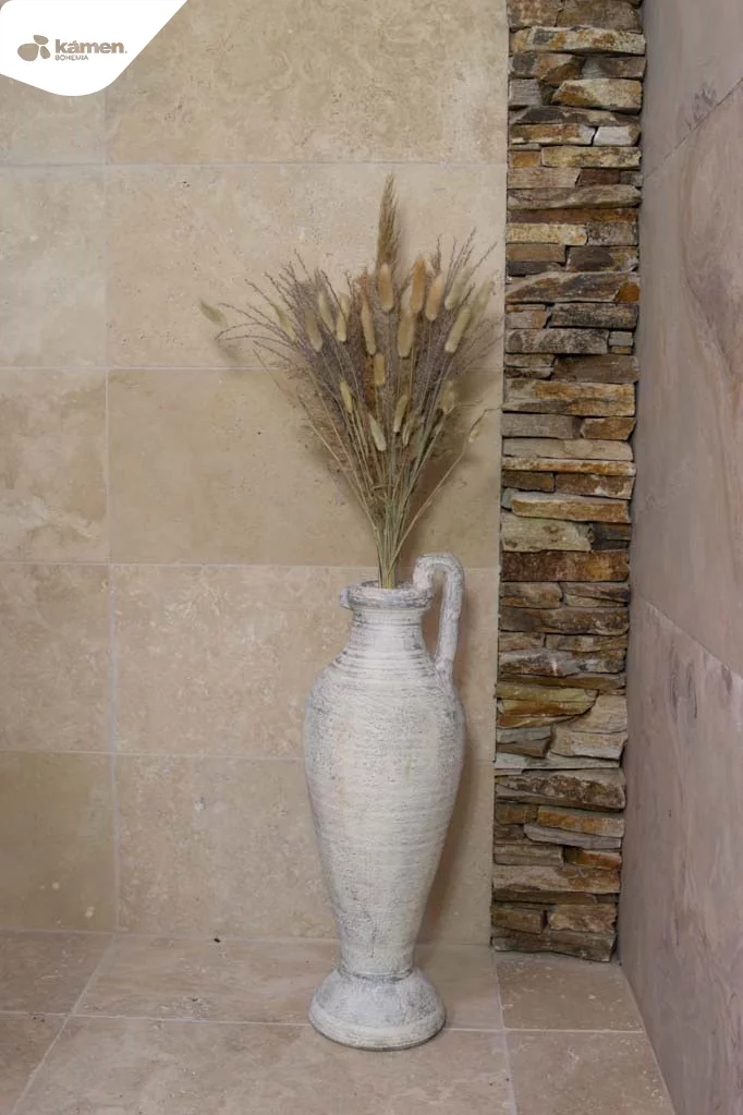 Formátovaný travertin s antikovaným povrchem krásně vynikne jako dlažba na terase, u bazénu či v letní kuchyňce. Díky pískové barvě je často používán i jako obklad krbu, soklu nebo fasády. Jeho antikovaná struktura propůjčí každé místnosti rustikální styl kde vyniknou barevné trvalky nebo zelené sukulenty. Údržba takového přírodního obkladu či dlažby je finančně i fyzicky nenáročná. Vybrat si můžete ze dvou tlouštěk: 1,2 cm - vhodnější na obklad a 3 cm - vhodnější na dlažbu.
