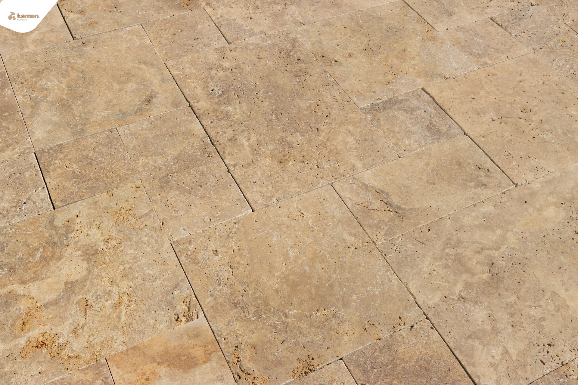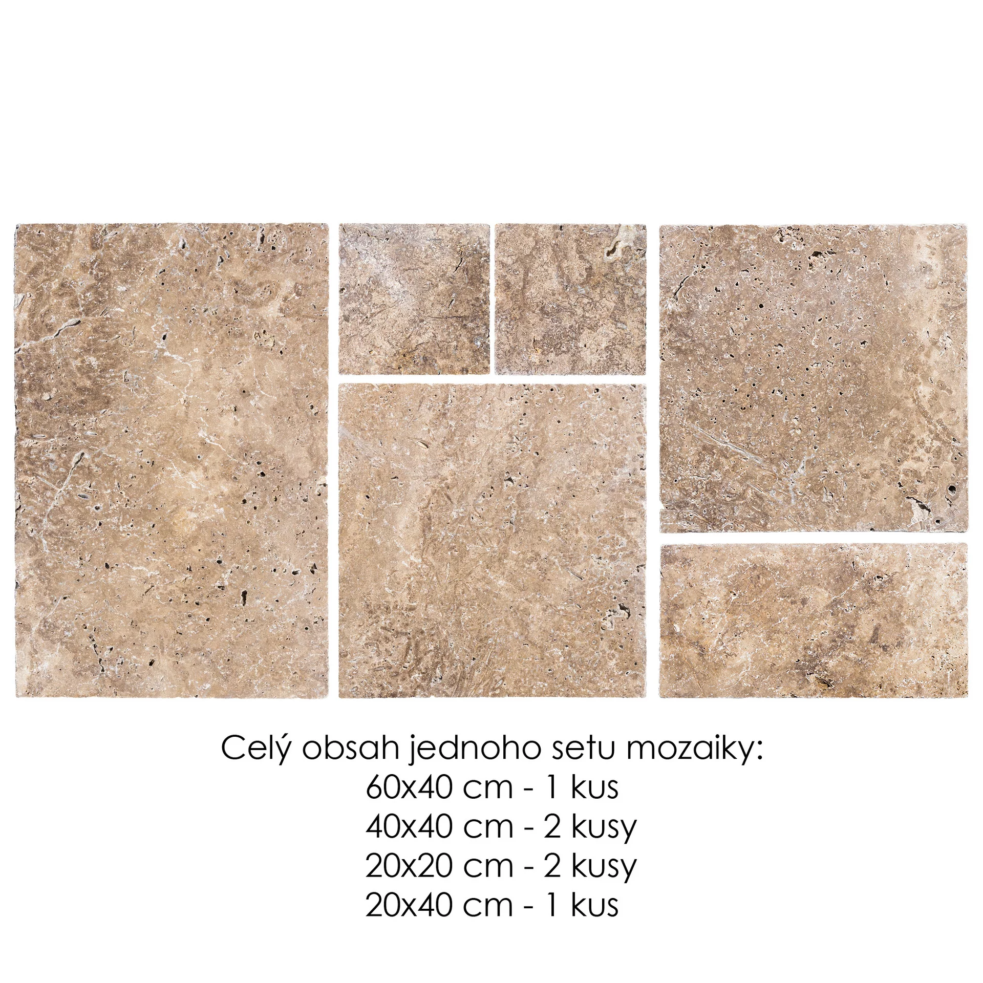 Přírodní formátovaný kámen z travertinu ve tvaru mozaiky s antikovaným povrchem. Takto formátovaná dlažba z přírodního kamene je vhodná na obklady a dlažby, fasádní obklady, interiérové kamenné obklady a dlažby, obklad krbu a podobně.