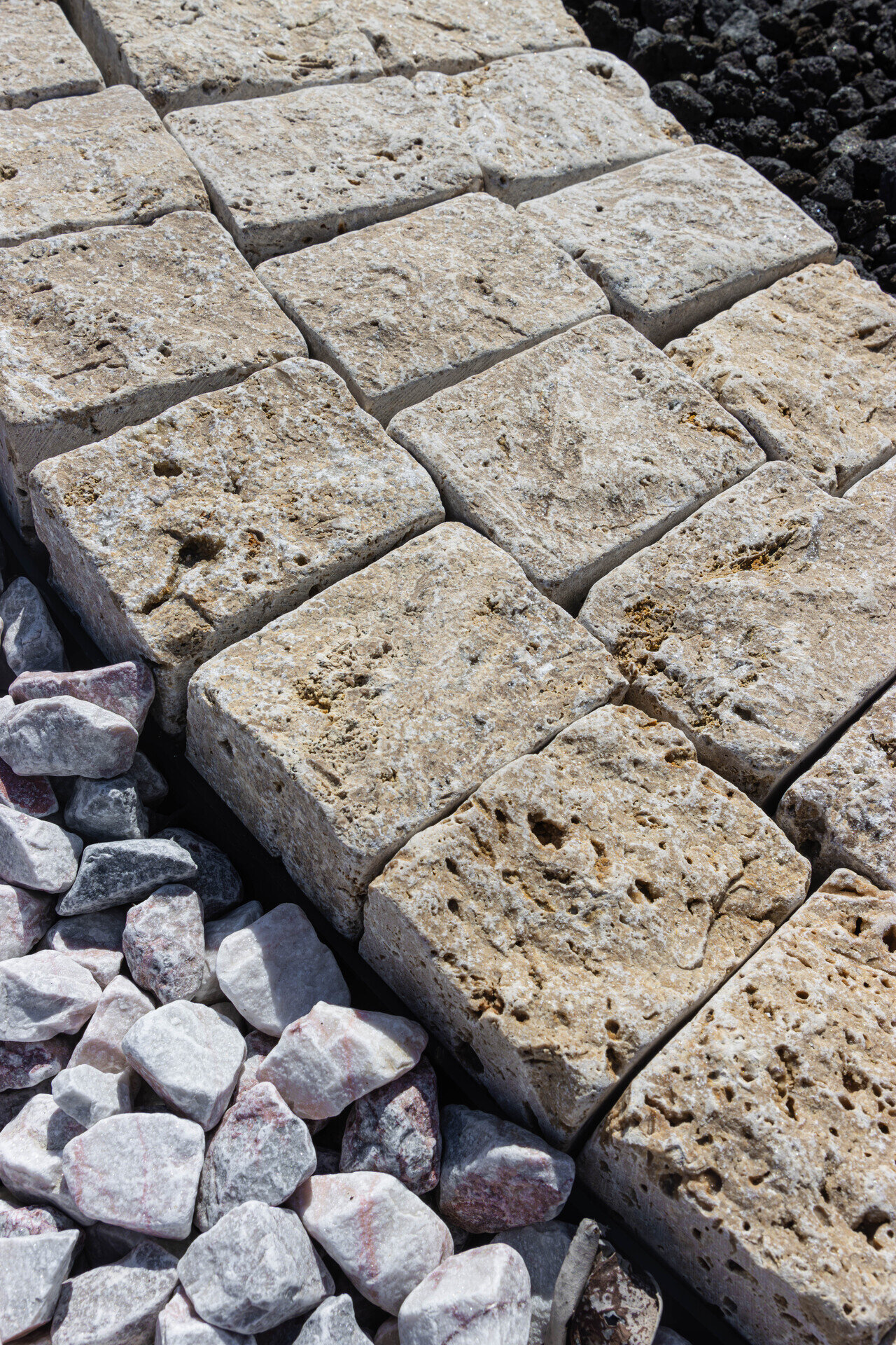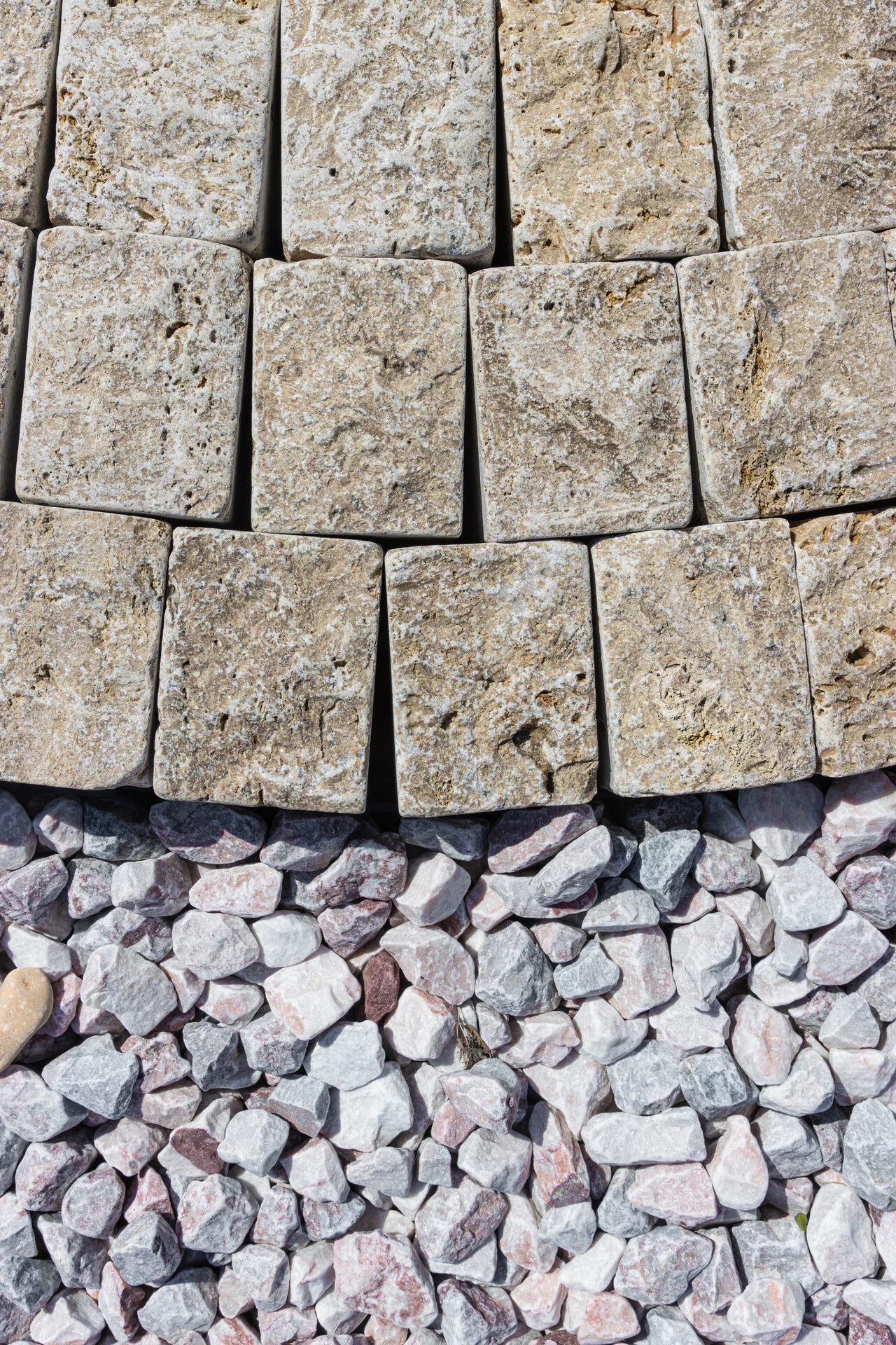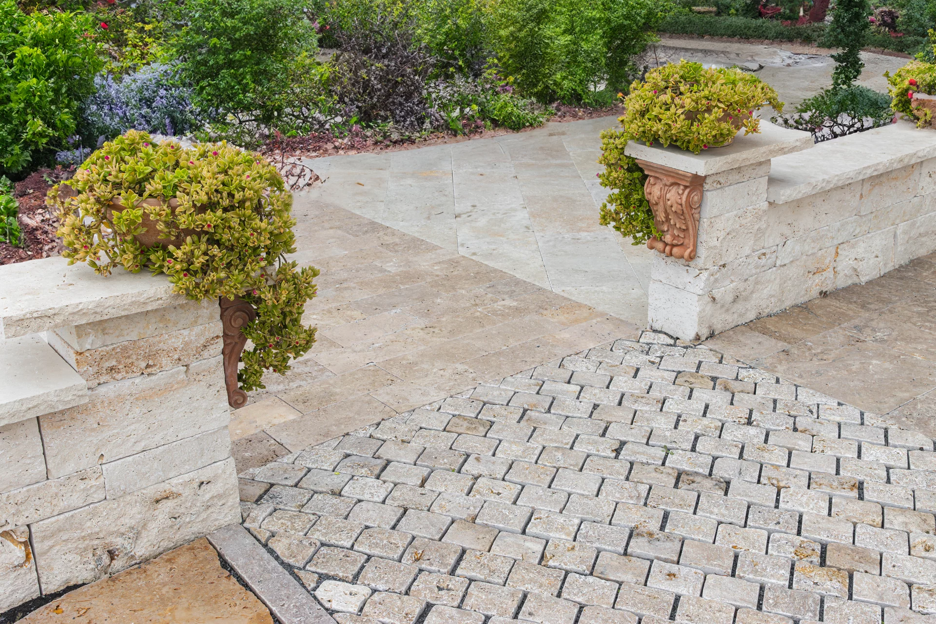 Kamenná kostka travertin je velmi oblíbeným přírodním kamenem pro výstavbu příjezdových cest či kamenných cestiček v zahradě. Hnědá barva nechává vyniknout okolí a dominantní zeleň zahrady. V kombinaci s barevnými kamennými kostkami vytvaruje na chodníku zajímavou, nápaditou koláž. Na větších plochách je možnost pokládat více druhů kamenných kostek do jedinečných vzorů, čímž dostaneme originální a unikátní architektonické dílo. Příjezdová cesta z kamenných kostek je kromě příjemného vzhledu také bezúdržbová a protiskluzová.